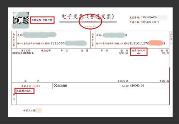 (1)票面左上角(二维码旁)显示“差额征税-差额开票”或“差额征税-全额开票”字样;