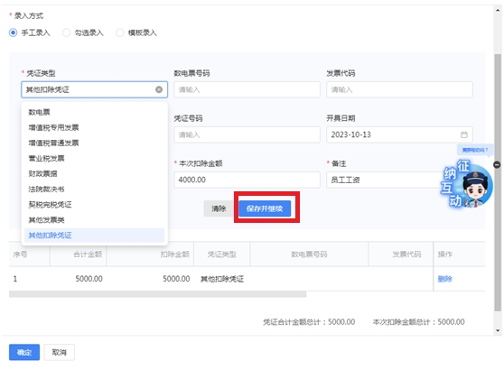 3.根据实际情况录入扣除信息,支持录入多份差额扣除凭证。录入完成后,完成所有扣除项录入后,点击【确定】按钮。