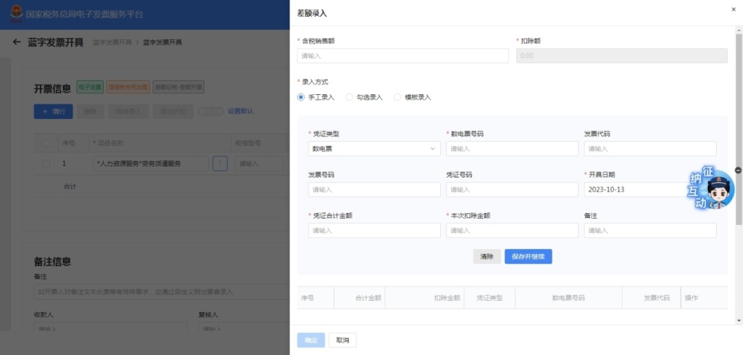 3.填写购买方信息后,录入或选择项目开票名称“人力资源服务*劳务派遣服务”,自动弹出扣除项填写界面。
