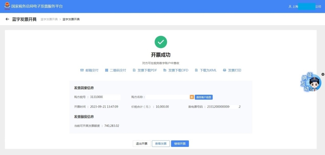 1.核对开票信息无误后,点击【发票开具】按钮,提示开具成功,即完成发票开具。
