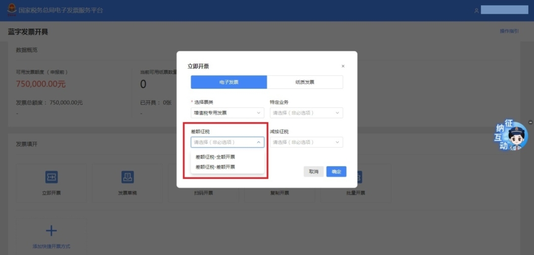 2.点击【立即开票】,选择【差额征税-差额开票】进入开票界面。