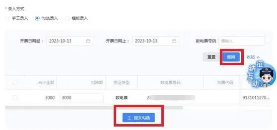 选择开票日期起止时间,点击【查询】,系统显示该时间段取得的发票信息,勾选差额扣除内容对应的发票,录入扣除额后,点击【提交勾选】。