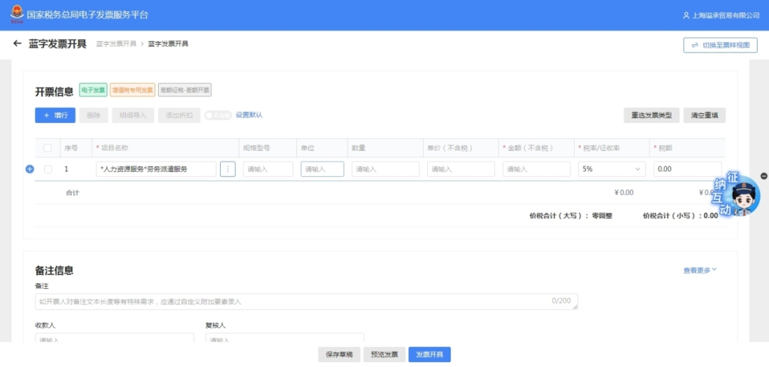 1.“差额征税-全额开票”操作流程:点击【立即开票】,选择发票票种,“差额征税”下拉选择“差额征税——全额开票”,点击【确定】。具体开票操作与一般蓝字发票开具操作相同,发票左上角显示“差额征税—全额开票”标签。不需要填写扣除项,直接录入全部金额开具金额即可。某些特定业务使用差额开票只能开具普通发票,比如劳务派遣服务、人力资源外包服务等。