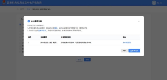 ?、倌裳≡癜炖砦唇崾孪?,完成后点击刷新,如无未结事项即可直接打印《清税证明》; ②您也可以选择签署承诺书,先行打印清税证明,在承诺期限内办结未结事项。纳税人采用承诺注销打印清税证明后,未办结事项可以通过登录电子税务局进入该功能“未办结事项告知”办理。
