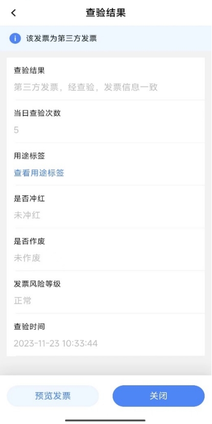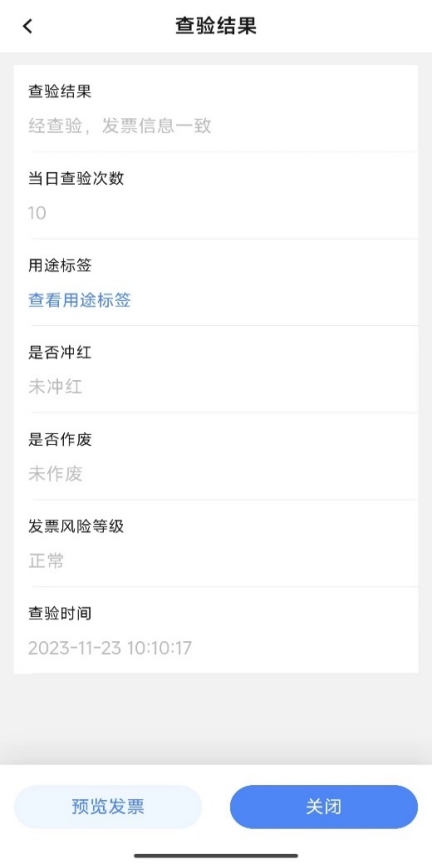 查验本人发票,且结果一致时,反馈查验结果“经查验,发票信息一致”,同时展示发票票面信息、发票标签信息(包括发票用途标签及红字发票标签等)及发票查验时间等信息;点击【预览发票】可以预览发票的票面。查询结果不一致的,反馈结果“经查验,发票信息不一致”,查验结果为不一致时不可预览发票。若未查到该发票信息,反馈结果为“未查询到该发票信息”。