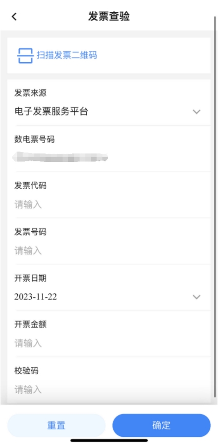 进入“发票查验”页面,可通过扫描已开具发票的票面二维码带出相关信息,也可在页面手动录入发票相关信息后点击【确定】按钮;若为本人发票,则只录入发票号码就可以查验,若为第三方发票,则提示填入开票日期及开票金额(含税金额)后进行查验。
