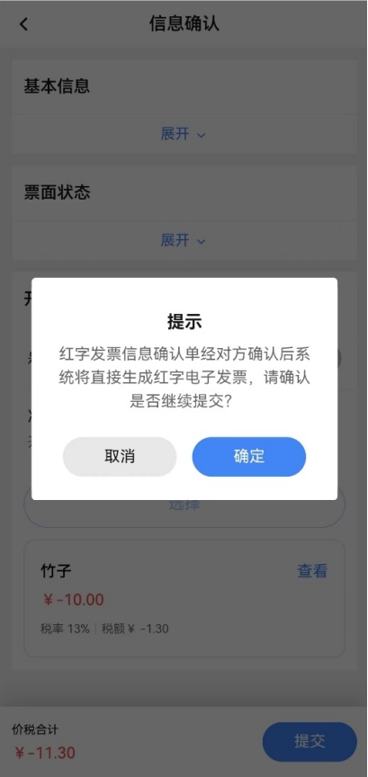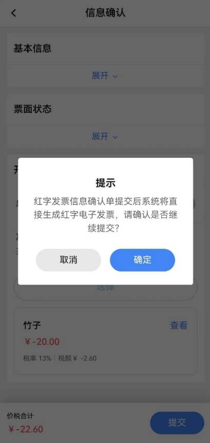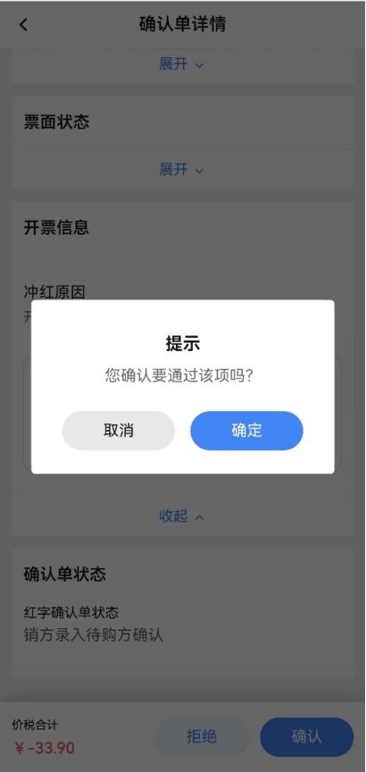 如蓝字发票为web端开具的纸质发票,在移动端发起确认单或在web端选择“与原蓝票一致票种的纸质发票”发起确认单,在移动端确认时,点击【确认】后,弹出“您确认要通过该项吗?”的提示。点击【确定】后,提示确认成功,还需在web端的【红字发票业务】-【红字发票开具】中点击【去开票】才能成功开具红字发票。