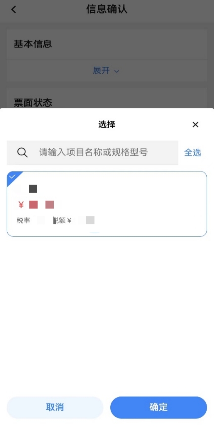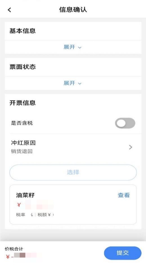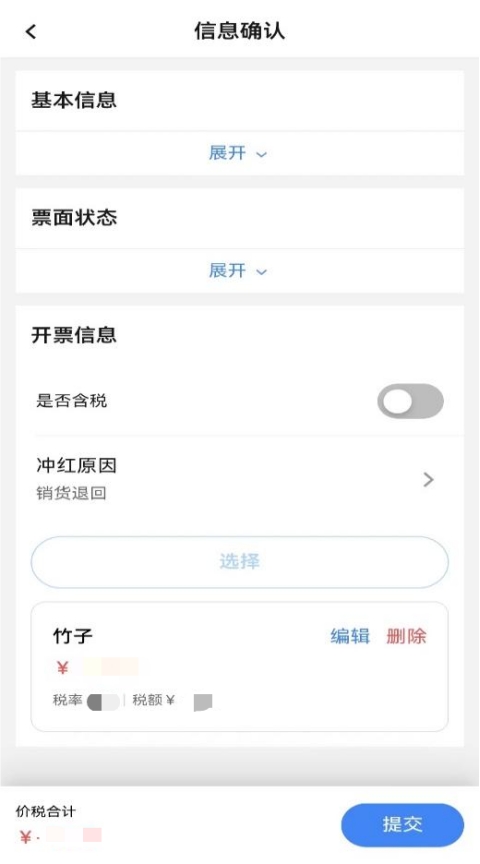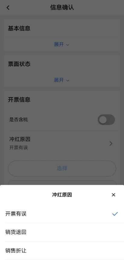 3.8 若蓝字发票“增值税用途标签”、“发票入账状态标签”任意一项不为空时允许部分红冲。系统带出蓝字发票商品明细,当开具红字发票原因为“销货退回”或“服务中止”只允许修改项目明细中数量、金额,当开具红字发票原因为“销售折让”可以录入金额。