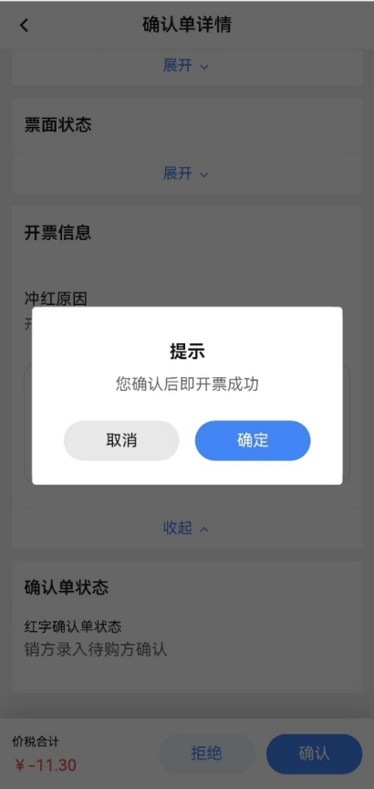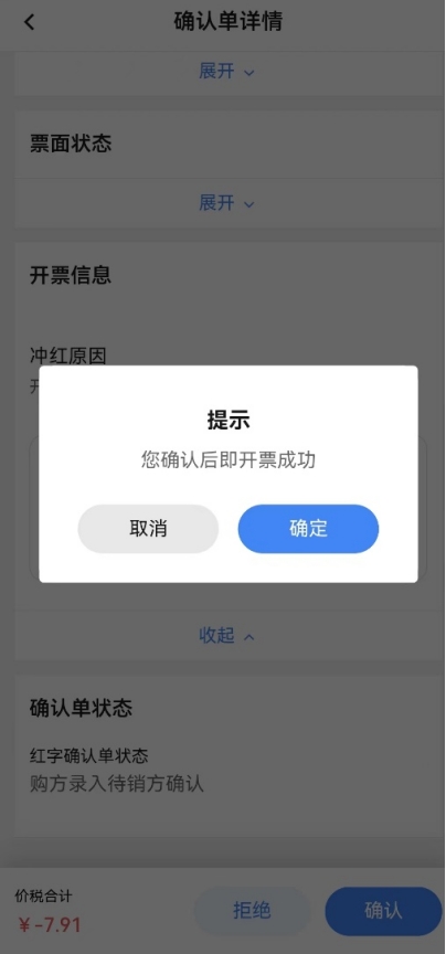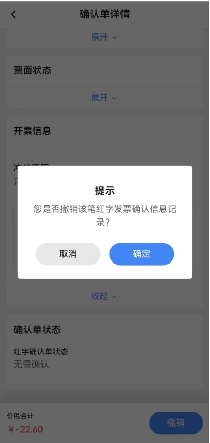 选择需要处理的红字信息确认单,点击后进入“确认单详情”页面。无需确认的情况下销方在红字发票未开具前,点击【撤销】弹出撤销提示,点击【确定】成功撤销此红字信息确认单。需要双方确认的场景发起方在对方未确认前,点击【拒绝】弹出撤销提示,点击【确定】成功撤销此红字信息确认单。
