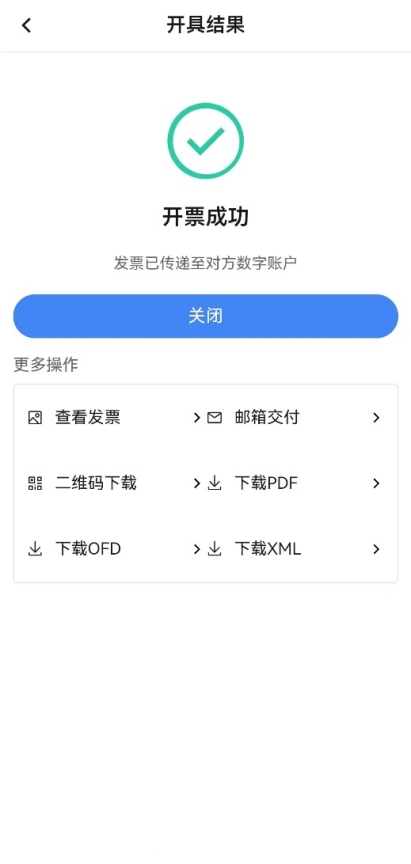 打开的确认单状态为“购方录入待销方确认”时,点击【确认】,弹出确认即开票提示,点击【确定】,红字发票开具成功,跳转到“开具结果”页面,此页面可查看开具的红字发票,同时展示各个发票交付渠道,可按各渠道按钮点击后进行相应交付。