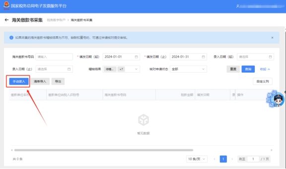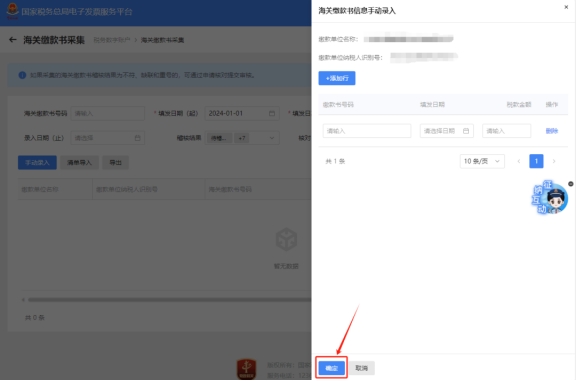 四、点击【手动录入】录入海关缴款书信息,点击“确定”成功后,稍后可在查询界面根据需要输入或选择相关查询条件,然后点击“查询”按钮,在结果展示区显示符合查询条件的海关缴款书。