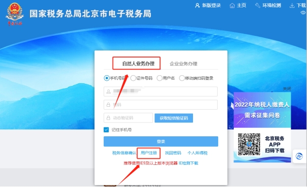 一、点击北京市电子税务局自然人业务办理——点击用户注册,完成个人账户注册,注册成功后登录自然人业务办理进入后按照提示做实名认证。