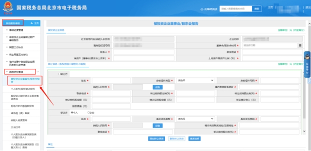 首先被投资企业登录北京市电子税务局备案(填写两张表)路径:请您点击【我要办税】—【其他服务事项】—【其他涉税事项】—【被投资企业董事会/股东会报告和个人股东/股权变动报告】;