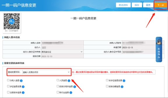 三、一照一码户登记信息变更页面,在查询变更项目中找相应人员的移动电话,填写变更后内容,点击下一步提交即可。