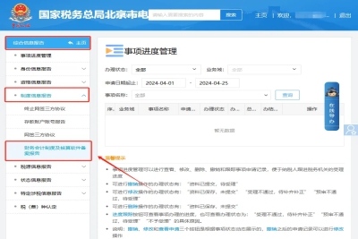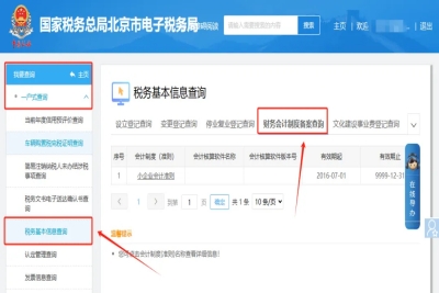 二、我要查询—一户式查询—税务基本信息查询—财务会计制度备案查询。