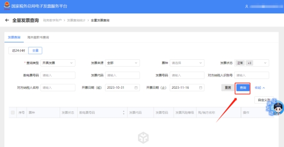 四、全量发票查询??榻?,选择查询条件后点击【查询】,系统会依据条件展示查询结果,在查询结果中选择需要导出的发票数据,点击“导出”即可。
