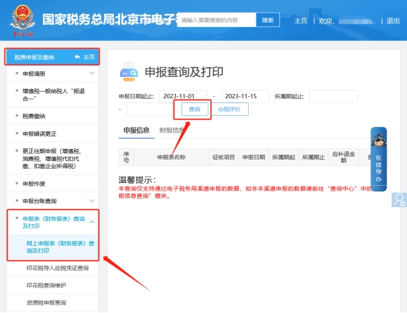 二、税费申报及缴纳—申报表(财务报表)查询及打印—网上申报表(财务报表)查询及打印??椴檠潞蟮谋ū硇畔⒓纯?。