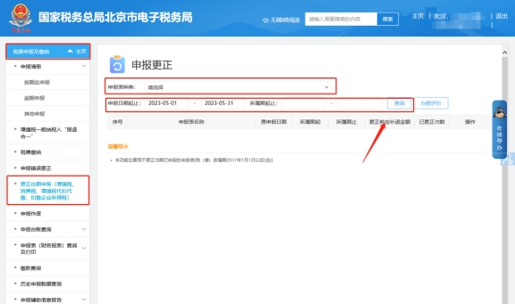 二、税费申报及缴纳—更正往期申报(增值税、消费税、增值税代扣代缴、扣缴企业所得税)???,根据查询条件找到报表后点击右侧的“更正申报”按钮进入表单完成修改及申报。