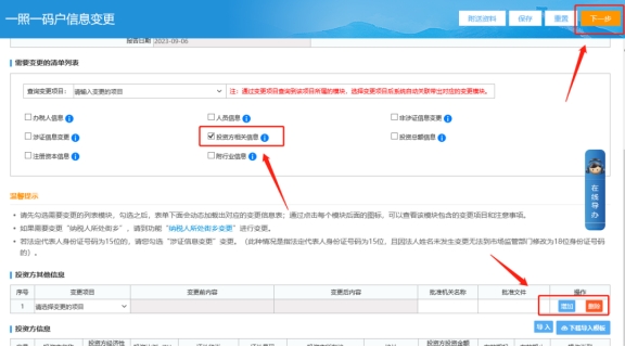 三、一照一码户登记信息变更页面,在此界面勾选“投资方相关信息”系统会带出变更项目,请您自行增加或删除修改,完成后点右上角下一步提交即可。