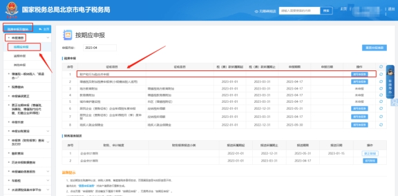 二、税费申报及缴纳—按期应申报—财产和行为税合并申报—点击填写申报表。