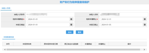 答、您好,请您点击【我要办税】—【税费申报及缴纳】—【按期应申报】—选择【财产和行为税合并申报】,点击【填写申报表】,再选择【财产和行为税申报查询维护】,点击右方的申报,在此界面调整日期查询。