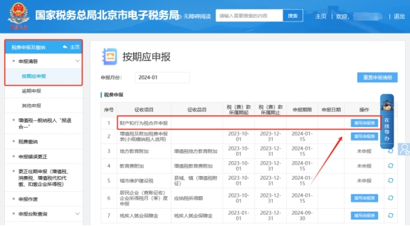 二、税费申报及缴纳—按期应申报—财产和行为税合并申报,点击【填写申报表】。