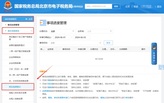 二、综合信息报告—身份信息报告 — 跨区税源登记,进入后点击“02 查询经营项目地址及税率”,在需要删除的项目地址后方操作下方点击【删除】即可。