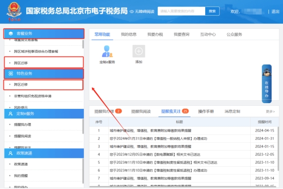 2.提交跨区迁移申请:请您在电子税务局主页点击:【套餐业务】/【特色业务】 — 【跨区迁移】 — 受理迁移采集表 — 填表,根据实际情况填写必填项 — 上传必传附件 — 提交等待受理即可。