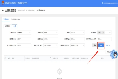 三、 全量发票查询页面,选择相应的查询条件,点击“查询”来查看相关发票。如需批量下载已开具的数电票,请先选中想要下载的发票,并点击“批量下载”按钮进行下载。