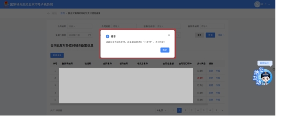 (3)当已备案记录的支付状态为“已支付”时,不允许作废。点击作废备案信息时弹出提示“请确认是否实际支付,此备案表状态为‘已支付’,不可作废”。