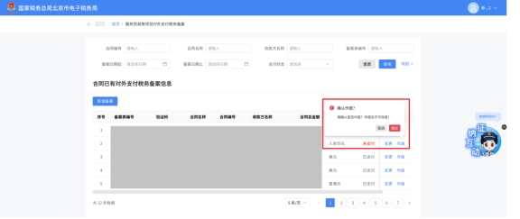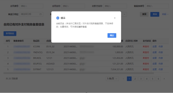 (3)对于已备案但无备案表编号的历史备案数据,不允许修改,只能作废。点击修改备案时弹出提示“当前历史(未与外汇局交互)对外支付税务备案信息,不支持修改;如要修改,可作废后重新备案”。