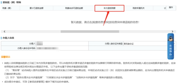 答:您好,请您在退税页面,往右侧拖动“退抵税(费)明细”下方的滚动条,后方会显示标黄的“本次退抵税额”,填写此项信息后再点下一步提交即可。