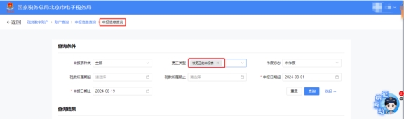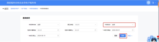 进入功能界面后,您可选择申报日期范围、税款所属期等筛选条件。如果需要根据申报表名称进行查询,点击【展开】进行申报表的选择,点击【查询】,对已完成申报的申报表信息进行查询。