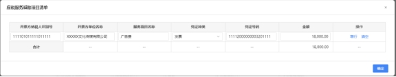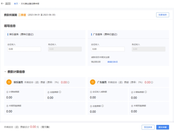 3)若缴费人同时发生广告业和娱乐业应税行为时,可在申报页面分别填报《文化事业建设费申报表(娱乐服务)》和《文化事业建设费申报表(广告服务)》《应税服务减除项目清单(广告服务)》。
