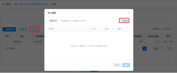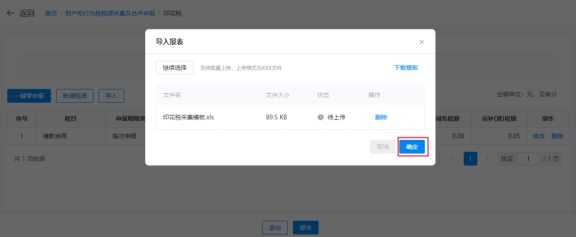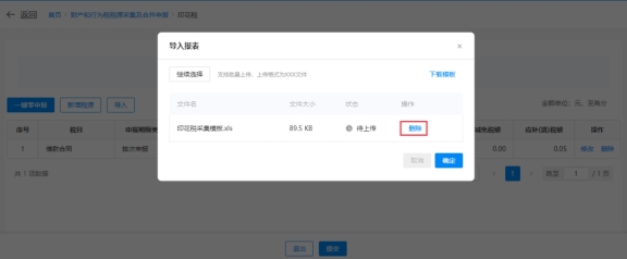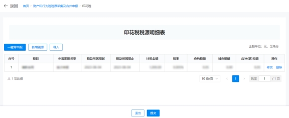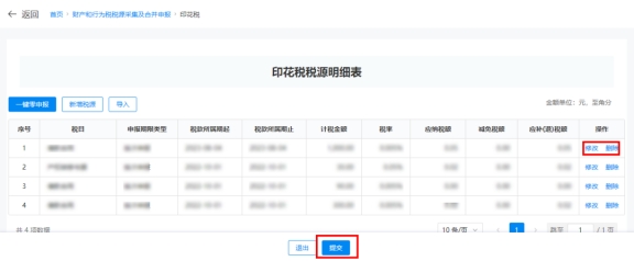 ?、苌洗晒?,系统在印花税税源明细表界面显示上传文件中的税源信息(若需要改动可手动修改),确认无误,点击【提交】。