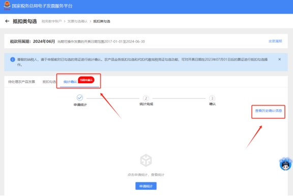 注:若要查询往期数据,可在此页面点击右侧【历史确认信息】进入,选择需要查看的所属月份即可。