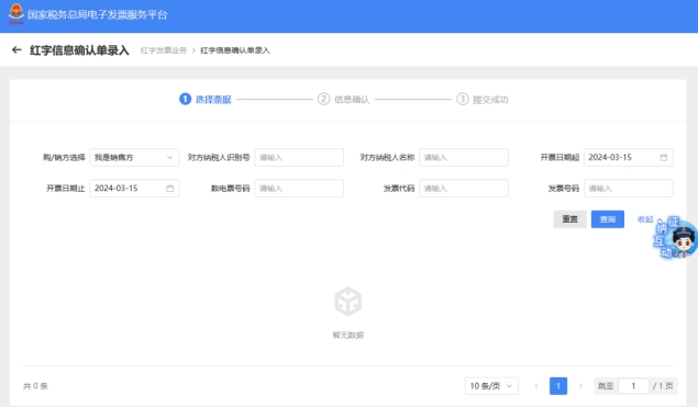 四、查询到发票信息并选择,进入后选择冲红的发票类型,核对下方带出的发票信息与对应发票号码代码,确认无误点击【提交】提示提交成功;若销方开具购方未认证,则会提示本次无需进行确认的字样,点击提示界面的【去开具】就会跳转到红字开具界面,核对无误后继续开红字(负数)发票。