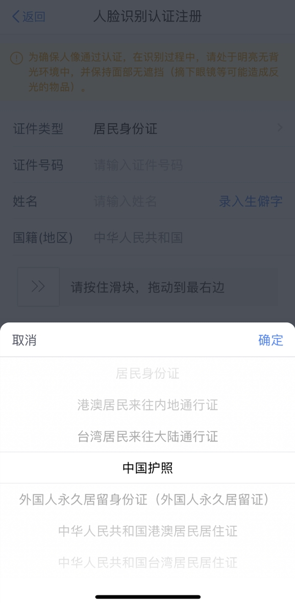 可以直接通过识别面孔进行实名认证,该注册方式支持的证件类型包括:居民身份证、港澳居民来往内地通行证、台湾居民来往大陆通行证、中国护照、外国人永久居留身份证(外国人永久居留证)、中华人民共和国港澳居民居住证、中华人民共和国台湾居民居住证。