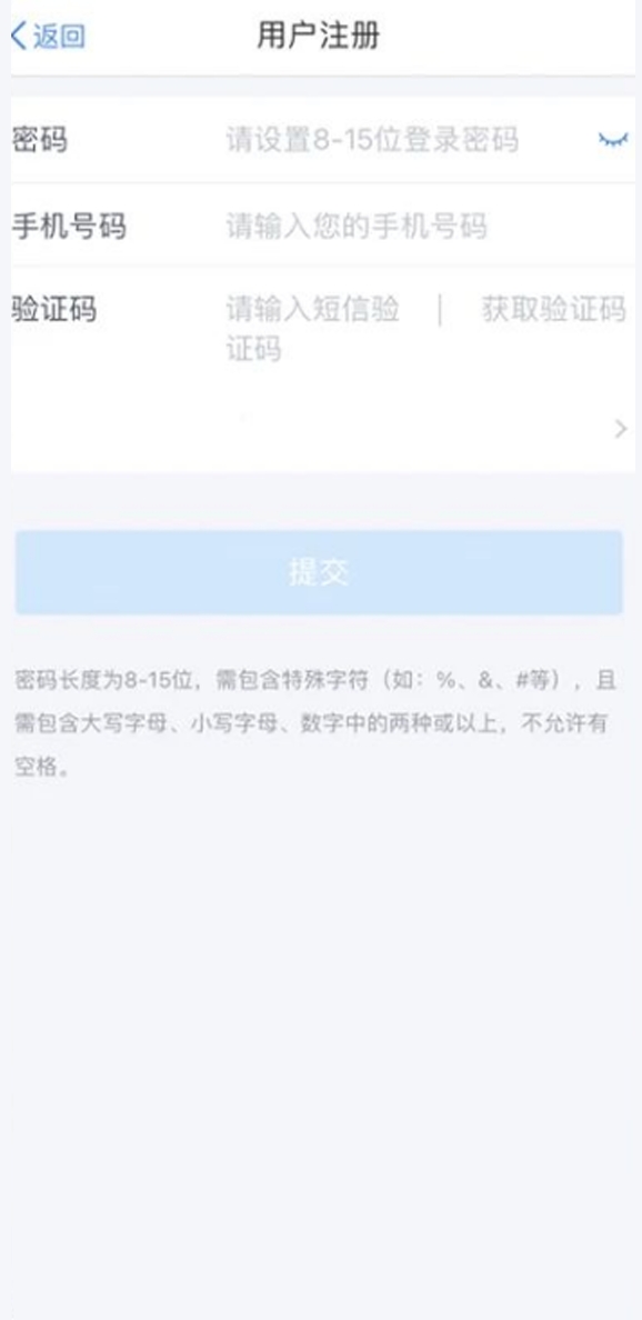 03、在【用户注册】页填写密码和手机号码,输入短信验证码,注册即完成。