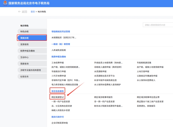 答、北京月销售额10万以内的小规模纳税人应该在【地方特色】—【我要办税】—【综合信息报告】—【跨区税源登记】功能中办理跨区税源登记。
