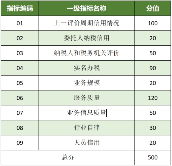 涉税专业服务机构信用积分共涉及9个一级指标,满分为500分。