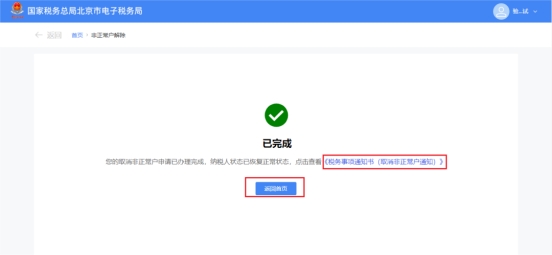 纳税人不存在未办结事项。系统直接跳转至取消非正?;隙ò炖沓晒缑?,点击【《税务事项通知书(取消非正?;ㄖ?》】可下载对应文书。点击【返回首页】可返回系统首页。