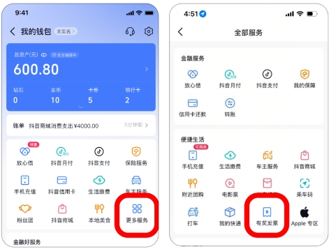 抖音支付:搜「有奖发票」「乐购新春」「发票抽奖」任意一个关键词就能进活动主会场,或者点「我」-「钱包」-「更多服务」-「有奖发票」,按要求上传就ok